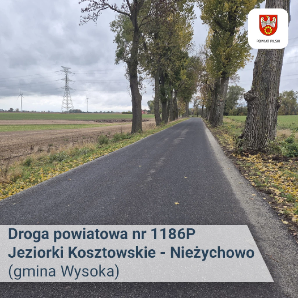Zakończono także prace na drodze powiatowej nr 1186P na odcinku Jeziorki Kosztowskie – Nieżychowo. Nową warstwę bitumiczną zyskał fragment o długości 700 metrów, znajdujący się na terenie gminy Wysoka. Wartość tego zadania to blisko 220 tys. zł.