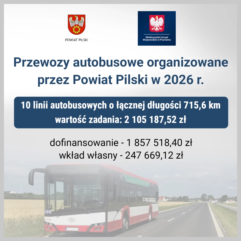 W ramach realizacji zadania funkcjonować będzie 10 linii autobusowych o łącznej długości 715,60 km. W najbliższym czasie podpisane zostaną stosowne umowy z przewoźnikami. Warto podkreślić, że Powiat Pilski zabezpieczył funkcjonowanie dodatkowych linii komunikacyjnych od 1 stycznia 2026 roku.