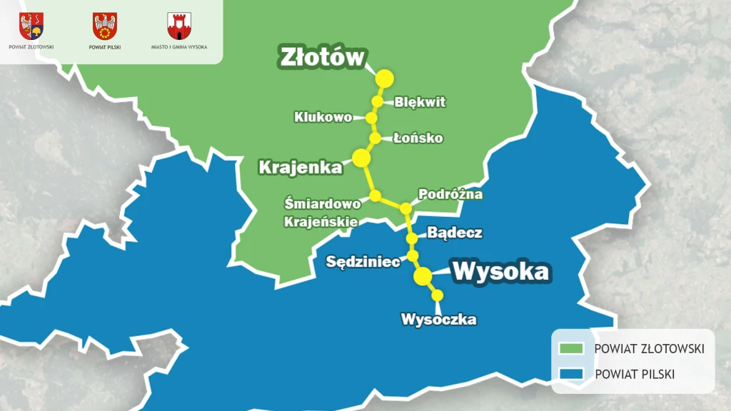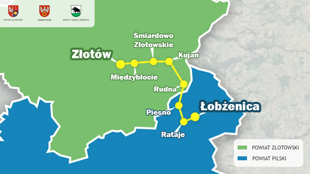 Linia Złotów – Łobżenica prowadzi przez miejscowości – w powiecie złotowskim: Złotów, Międzybłocie, Śmiardowo Złotowskie, Kujan, Rudna, a w powiecie pilskim: Piesno, Rataje i Łobżenica. Nowa linia Złotów – Wysoczka połączy w powiecie złotowskim: Złotów, Błękwit, Klukowo, Łońsko, Krajenkę, Śmiardowo Krajeńskie i Podróżną, a w powiecie pilskim: Bądecz, Sędziniec, Wysoką i Wysoczkę.