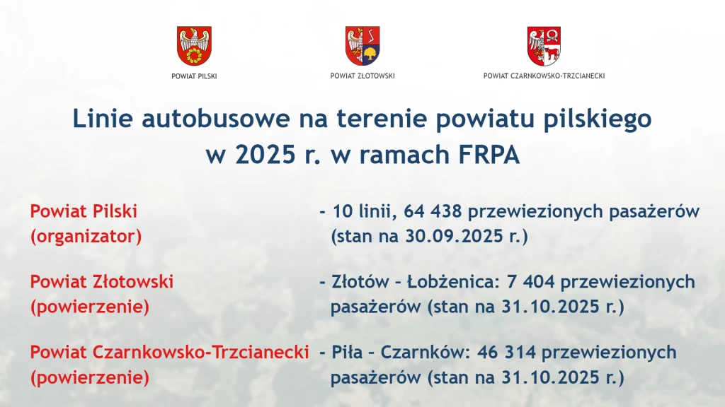 W 2025 roku Powiat Pilski jest organizatorem 10 linii autobusowych w ramach dofinansowania z Funduszu Rozwoju Przewozów Autobusowych, na których przewieziono już 64,5 tysiąca pasażerów. Powierzona Powiatowi Złotowskiemu linia Złotów – Łobżenica przewiozła już prawie 7,5 tysiąca osób, a linia Piła – Czarnków, powierzona Powiatowi Czarnkowsko-Trzcianeckiemu, 46,5 tysiąca pasażerów (dane dot. 2025 r.). Niebawem Powiat Pilski podpisze z Powiatem Czarnkowsko-Trzcianeckim porozumienie na organizację tej linii również w 2026 roku.
