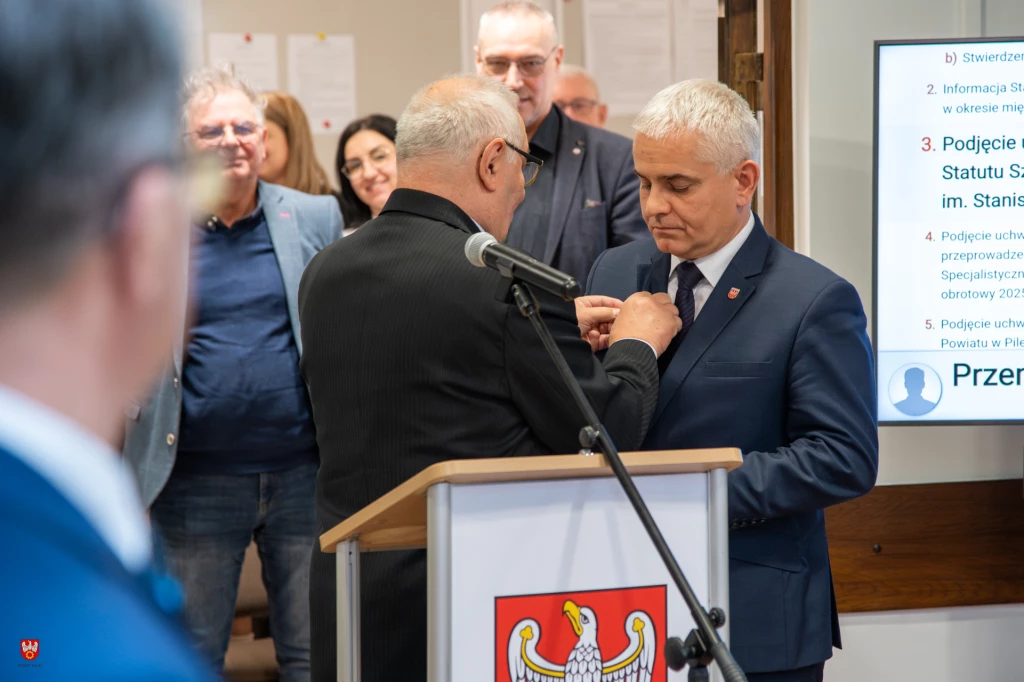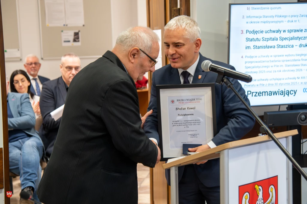 Ponadto, podczas wczorajszej sesji, starosta pilski Rafał Zdzierela, został uhonorowany prestiżowym wyróżnieniem – Złotą Honorową Odznaką Polskiego Związku Judo. Odznakę wręczył Józef Jopek, prezes Okręgowego Związku Judo w Poznaniu oraz przedstawiciel krajowych władz Związku.