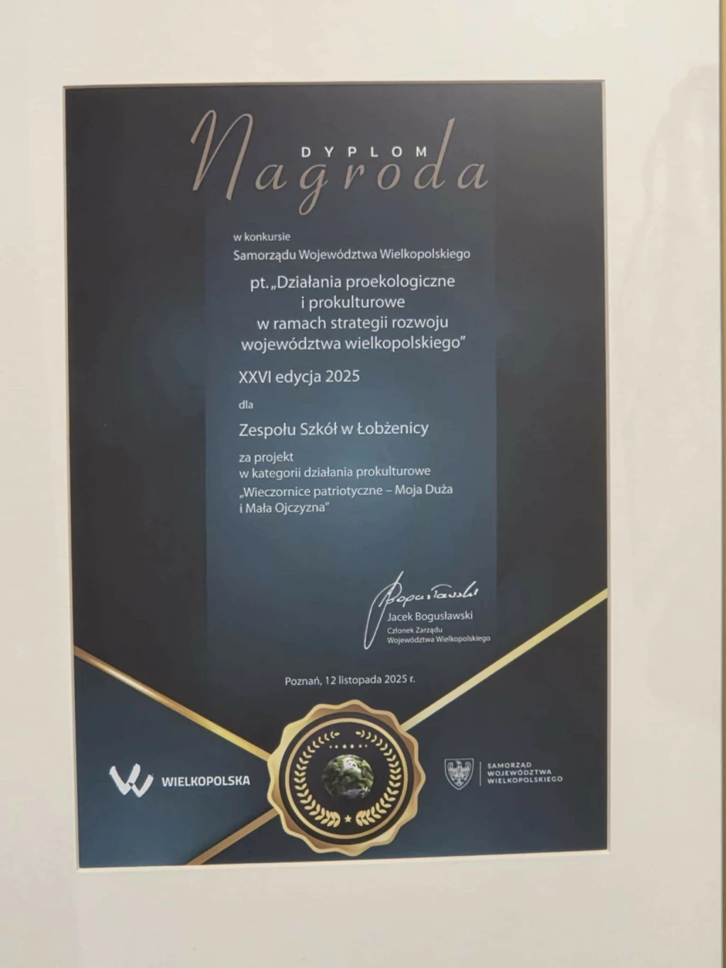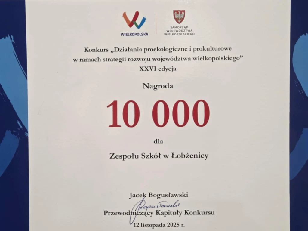 Gala wręczenia nagród odbyła się 12 listopada 2025 r. w Poznaniu. W kategorii „działania proekologiczne” nagrodzono 60 spośród 118 zgłoszonych wniosków, natomiast w kategorii „działania prokulturowe”, w której oceniany Zespół Szkół w Łobżenicy, nagrodzono 60 ze 182 projektów. Przewodniczącym kapituły konkursu był Jacek Bogusławski, członek Zarządu Województwa Wielkopolskiego.