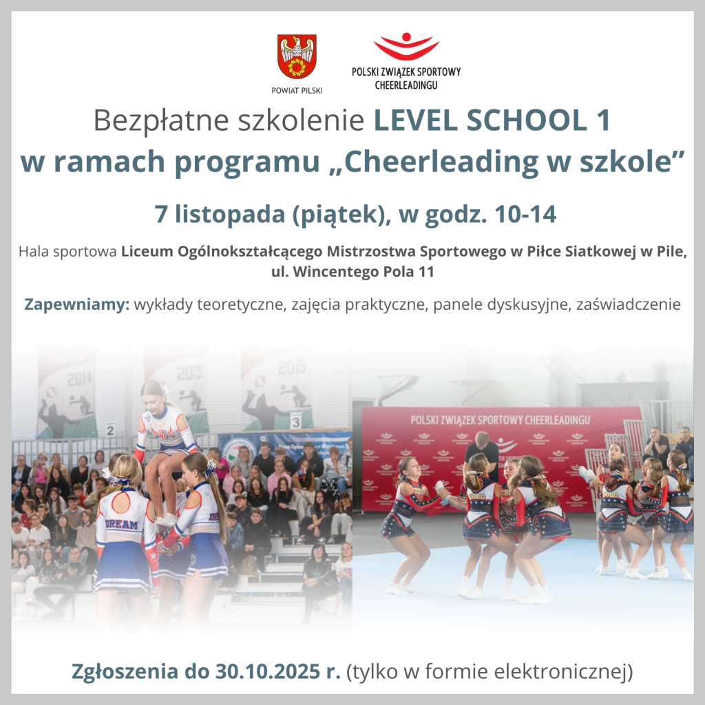 Polski Związek Sportowy Cheerleadingu oraz Powiat Pilski zapraszają nauczycieli i osoby prowadzące szkolne amatorskie zespoły gimnastyczno-taneczne.na bezpłatne szkolenie LEVEL SCHOOL 1, realizowane w ramach programu „Cheerleading w szkole”.