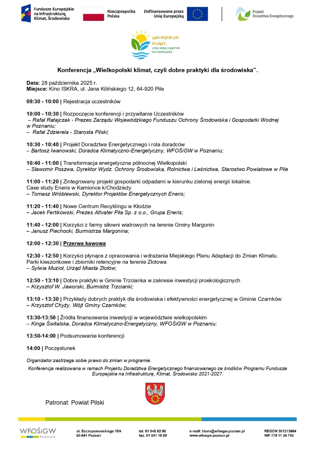 We wtorek, 28 października 2025 roku, w Kinie ISKRA w Pile odbędzie się konferencja pt. „Wielkopolski klimat, czyli dobre praktyki dla środowiska”. Wydarzenie organizowane jest przez Wojewódzki Fundusz Ochrony Środowiska i Gospodarki Wodnej w Poznaniu, a patronat honorowy nad konferencją objął starosta pilski Rafał Zdzierela.
