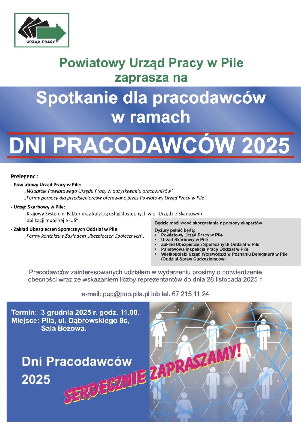 Prosimy pracodawców o potwierdzenie udziału wraz ze wskazaniem liczby reprezentantów do 28 listopada 2025 roku drogą mailową: pup@pup.pila.pl lub telefonicznie: 67 215 11 24.