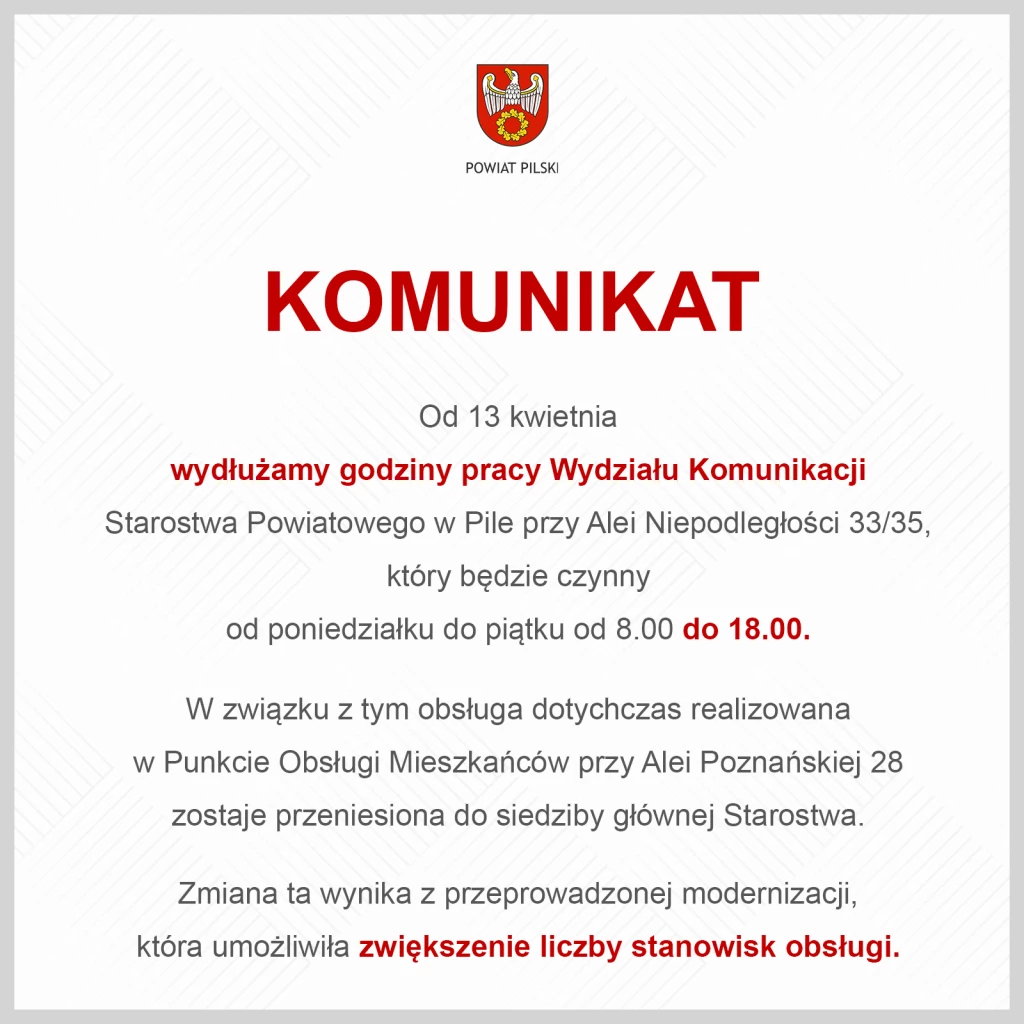 Informujemy mieszkańców, że od 13 kwietnia 2026 r. wydłużony zostanie czas pracy Wydziału Komunikacji w Starostwie Powiatowym przy Alei Niepodległości 33/35 w Pile.