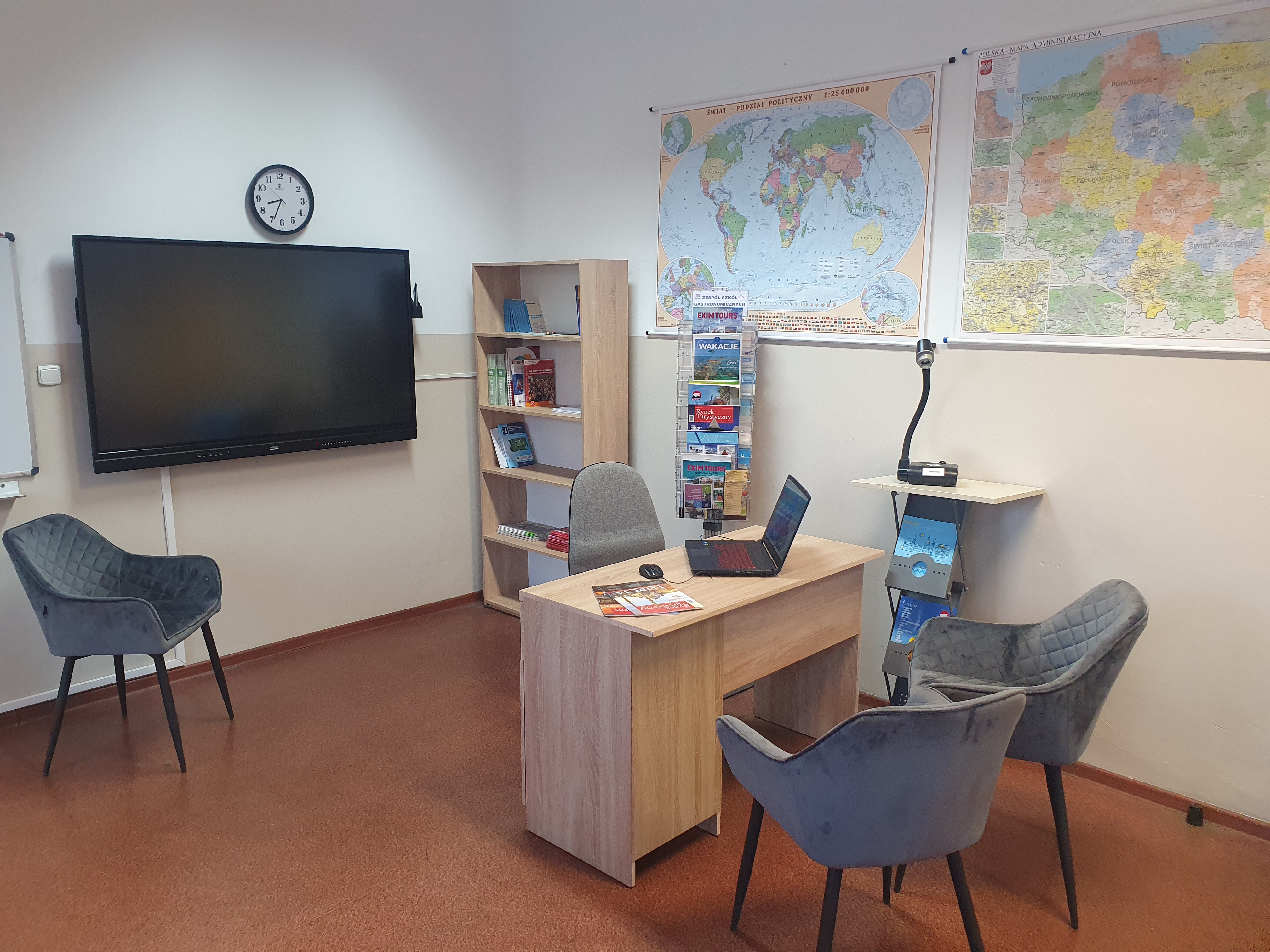 W pracowni takiej powinien znaleźć się wydzielony punkt informacji turystycznej i stanowisko pracownika biura podróży wyposażone w meble biurowe.