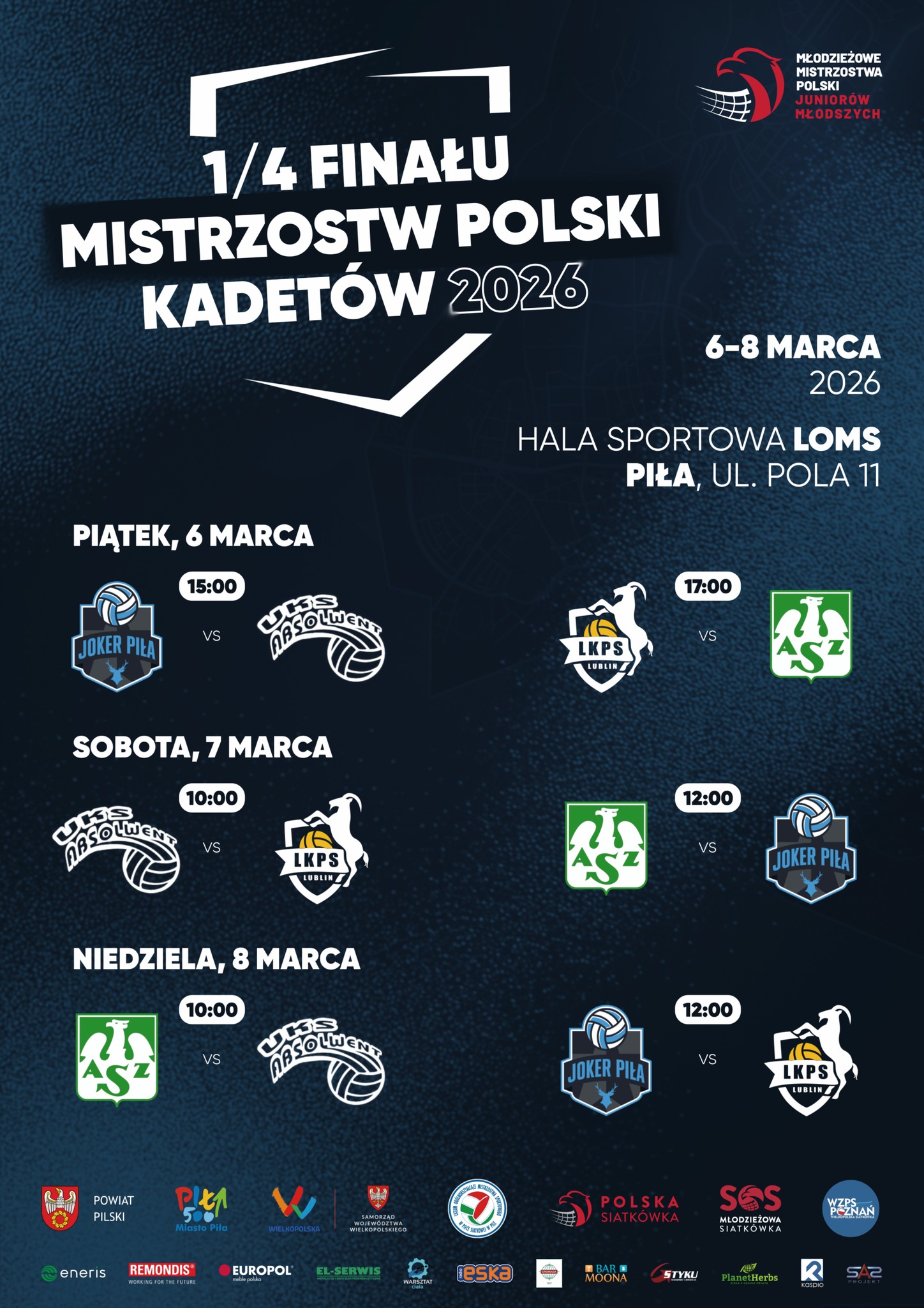 W dniach 6-8 marca 2026 r. odbędzie się w Pile 1/4 Finału Mistrzostw Polski Kadetów w siatkówce.