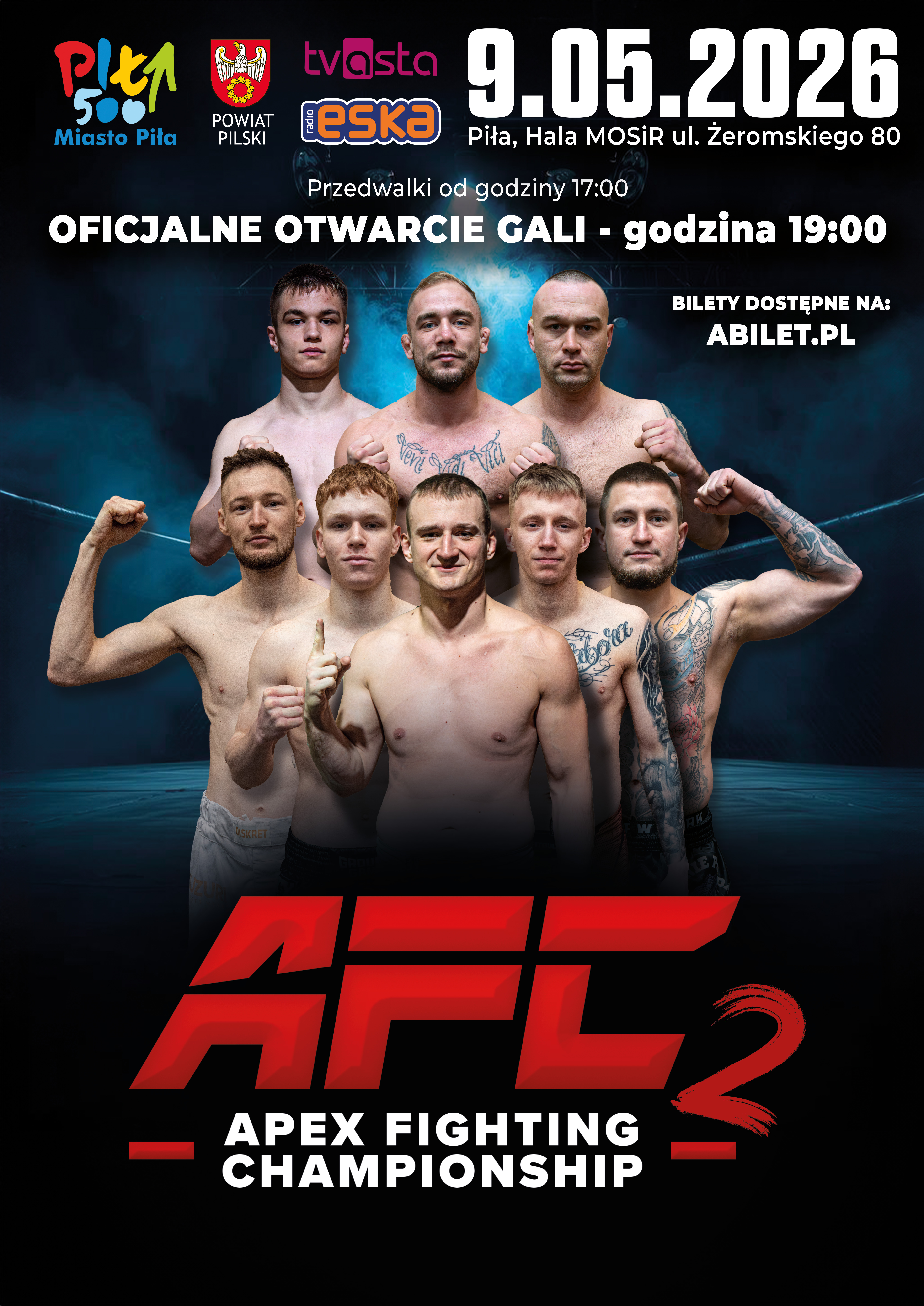 9 maja 2026 r. w Hali MOSiR przy ul. Żeromskiego 90 w Pile odbędzie się gala AFC 2 - Apex Fighting Championship.