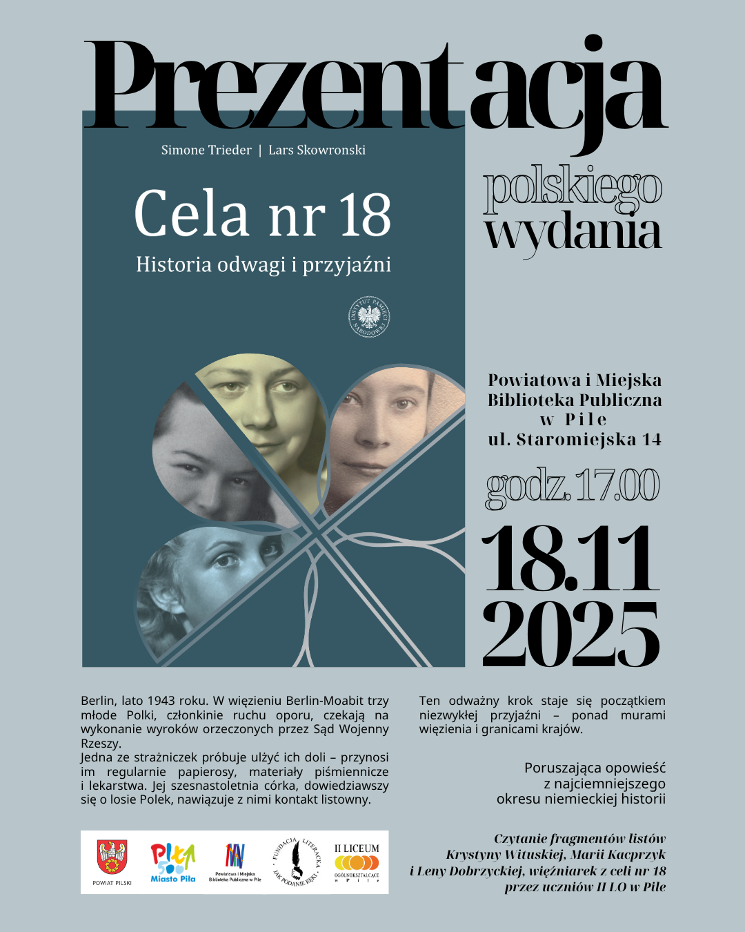 II Liceum Ogólnokształcące w Pile, Powiatowa i Miejska Biblioteka Publiczna im. Pantaleona Szumana w Pile oraz Fundacja Literacka „Jak podanie ręki” serdecznie zapraszają na prezentację polskiego wydania książki Simone Trieder i Larsa Skowrońskiego pt. „Cela nr 18. Historia odwagi i przyjaźni”.