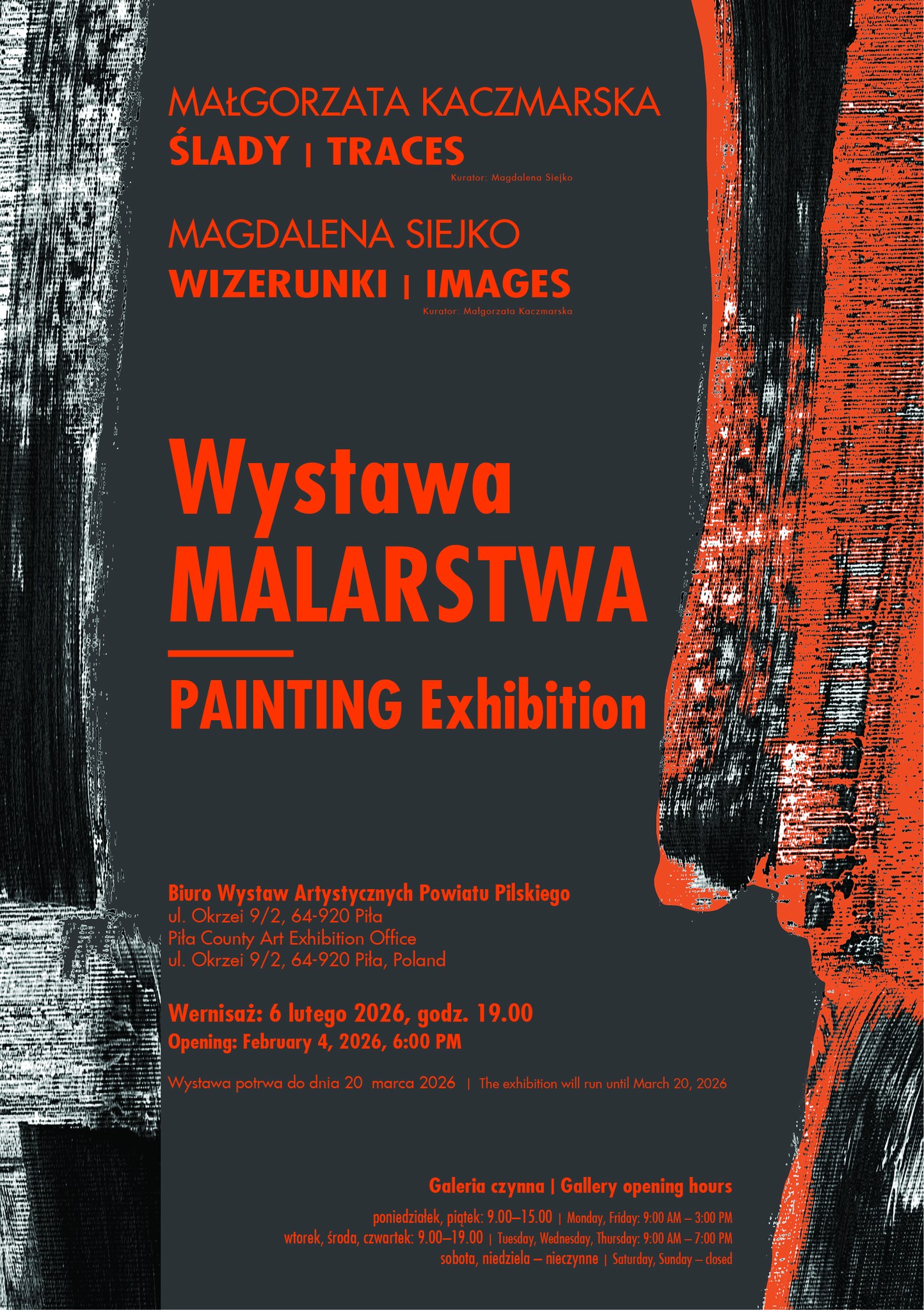Prace zaprezentują dwie malarski pochodzące z Krakowa: Małgorzata Kaczmarska w ekspozycji Ślady / Traces oraz Magdalena Siejko z wystawą Wizerunki / Images. Wernisaż w piątek, 6 lutego, o godz. 19.00.