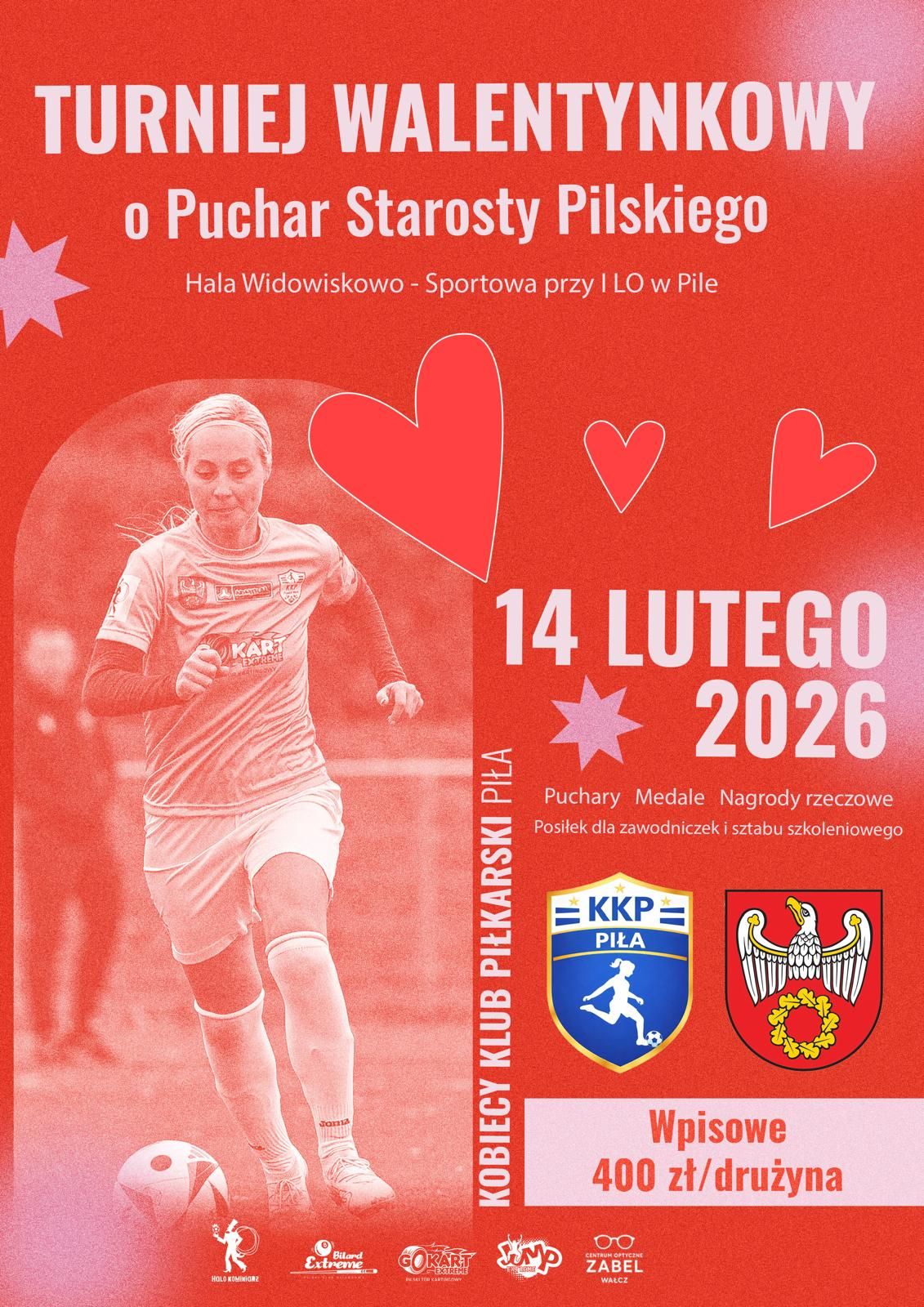 14 lutego 2026 roku w hali sportowej przy ul. W. Pola w Pile odbędzie się halowy turniej piłki nożnej kobiet pn. "Turniej Walentynkowy o Puchar Starosty Pilskiego".
