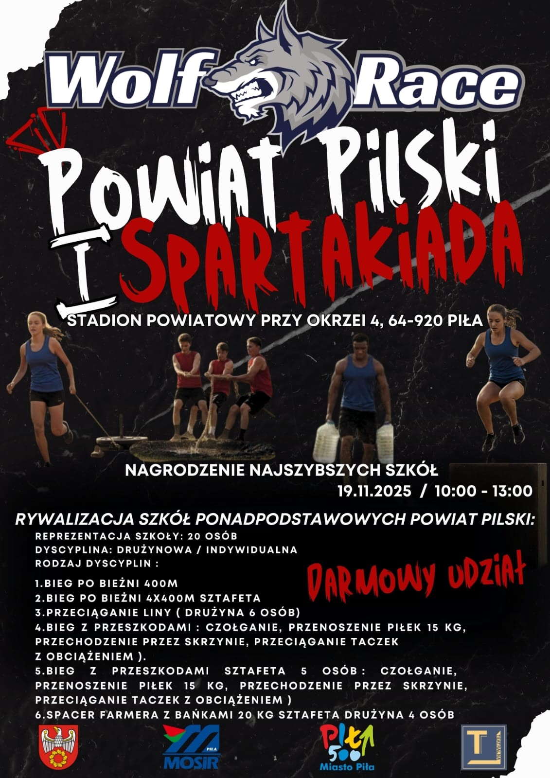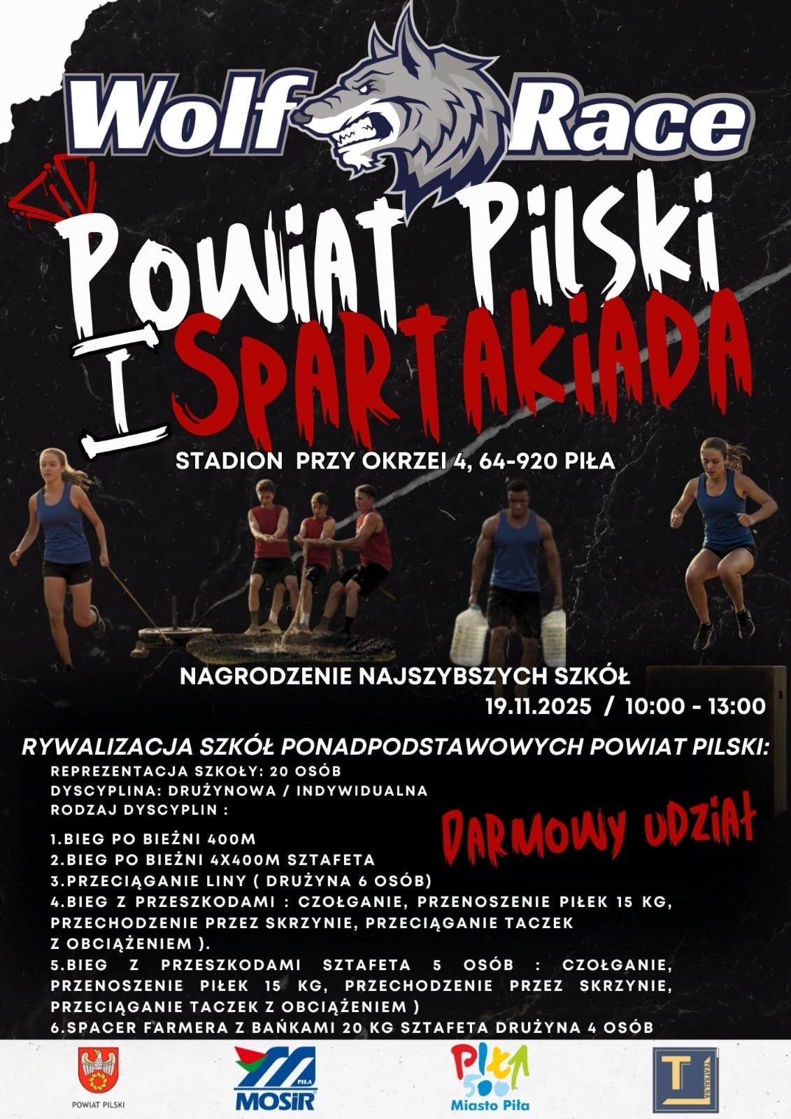 19 listopada 2025 r. na Stadionie przy ul. Okrzei w Pile odbędzie się I Spartakiada Wolf Race szkół ponadpodstawowych Powiatu Pilskiego.