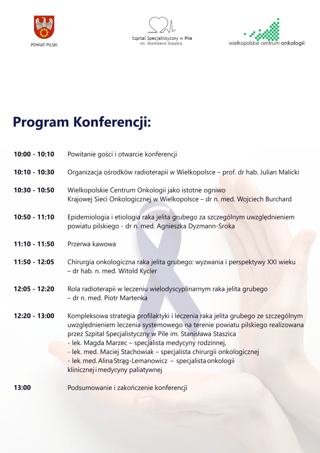 12:20 – 13:00 Kompleksowa strategia profilaktyki i leczenia raka jelita grubego ze szczególnym uwzględnieniem leczenia systemowego na terenie powiatu pilskiego realizowana przez Szpital Specjalistyczny w Pile im. Stanisława Staszica - lek. Magda Marzec, specjalista medycyny rodzinnej, lek. med. Maciej Stachowiak, specjalista chirurgii onkologicznej, lek. med. Alina Strąg-Lemanowicz, specjalista onkologii klinicznej i medycyny paliatywnej